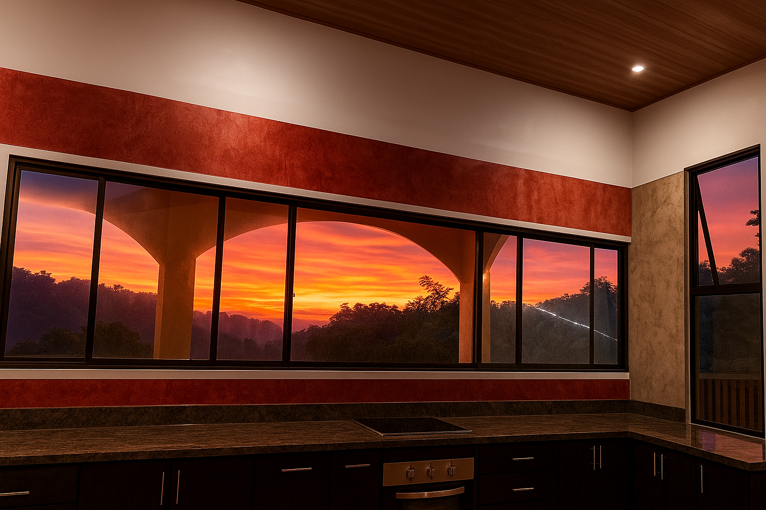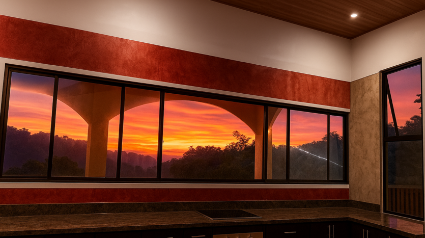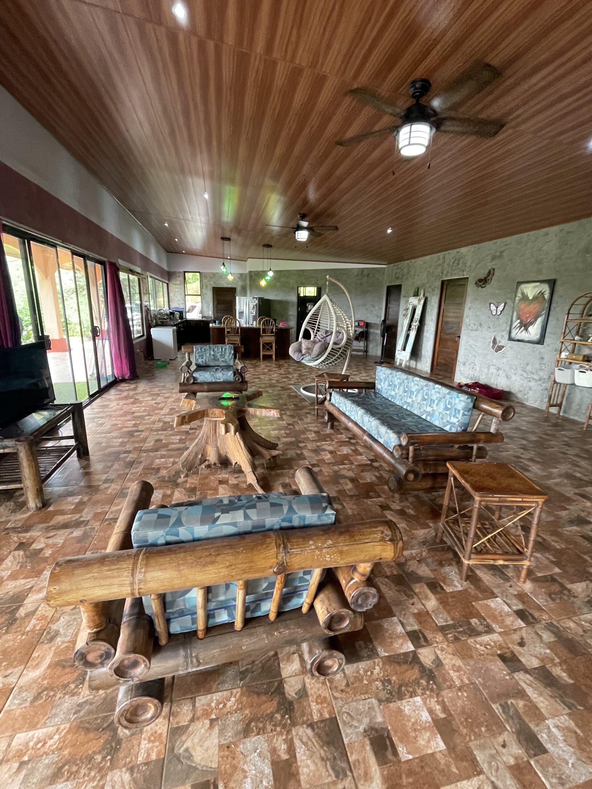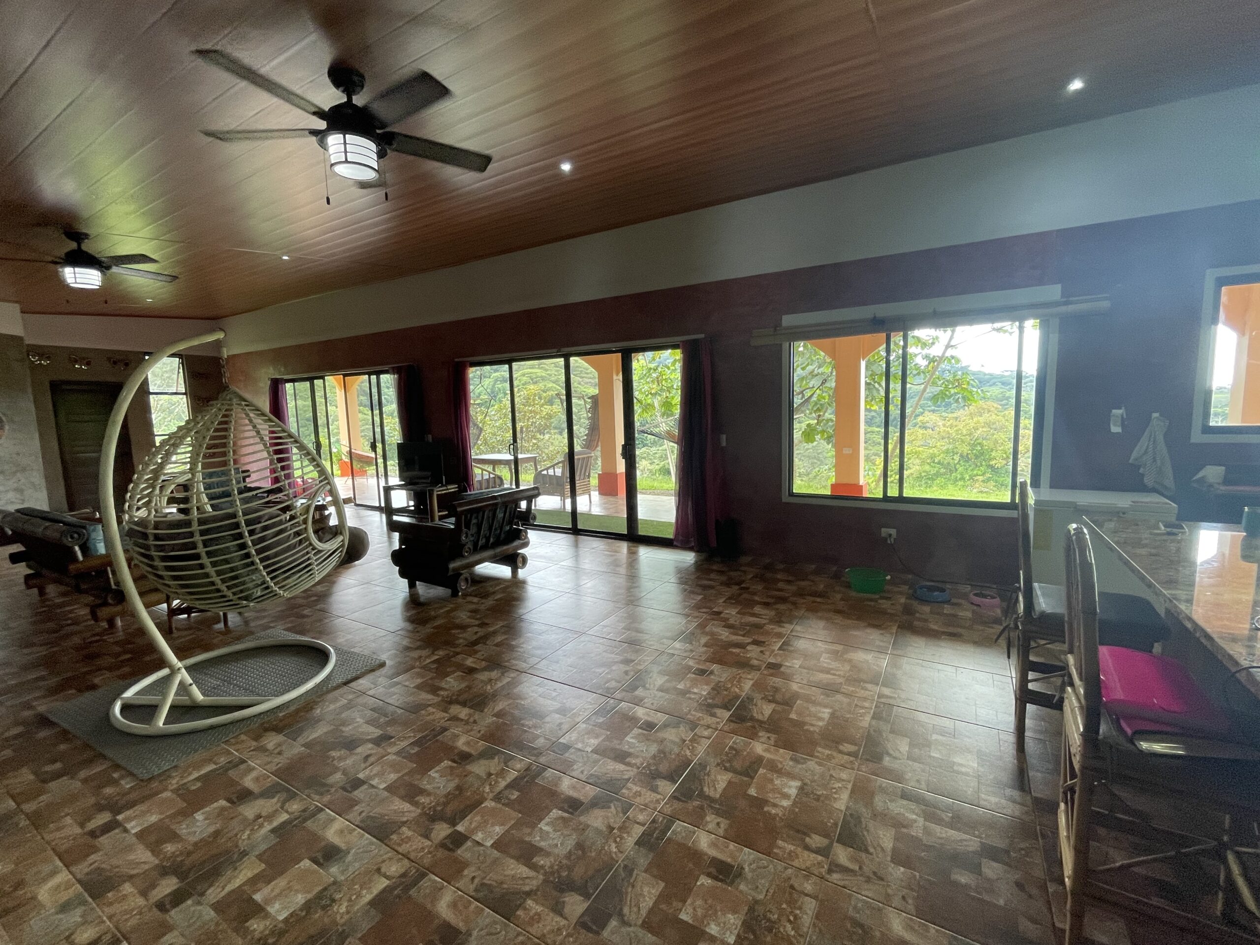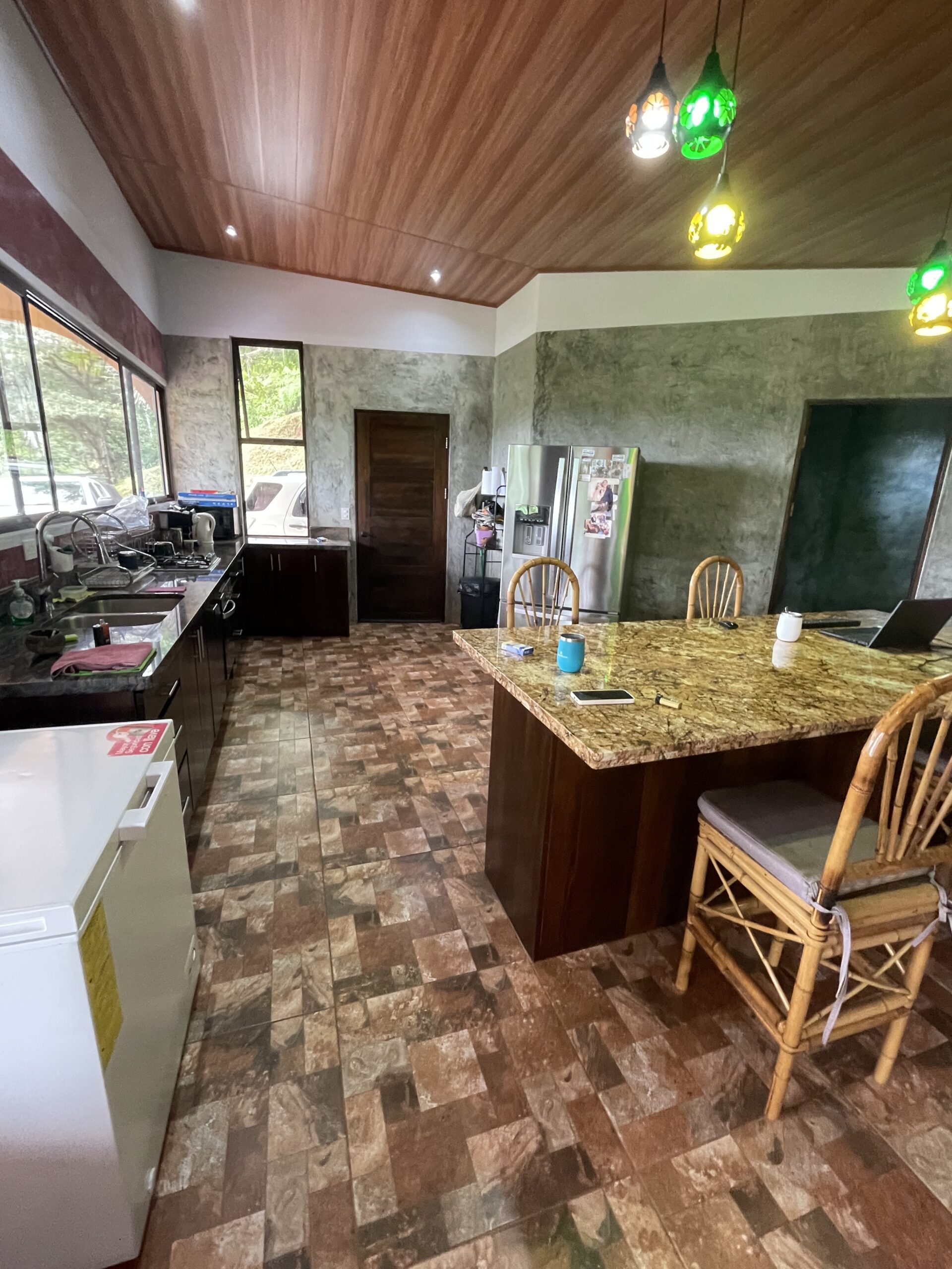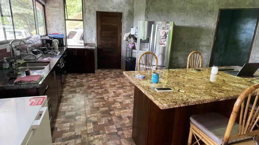 Step inside to discover a bright, airy open floor plan with soaring ceilings and large picture windows that frame sweeping views of the jungle canopy and the distant Pacific. The spacious living area flows naturally into a bohemian-inspired kitchen, featuring marble countertops, handcrafted cedar cabinetry, a large center island, and quality appliances including a gas stove and built-in electric oven.