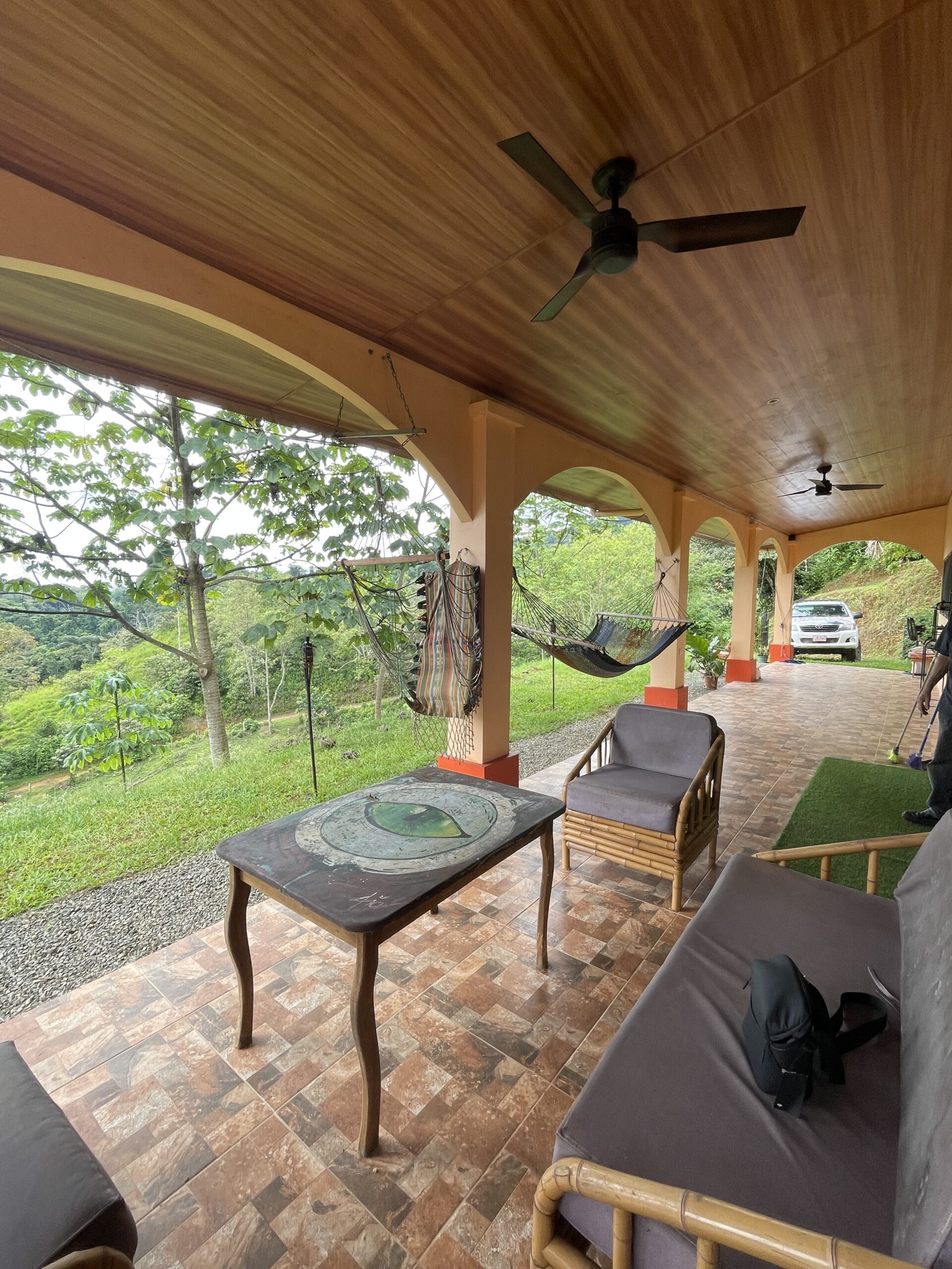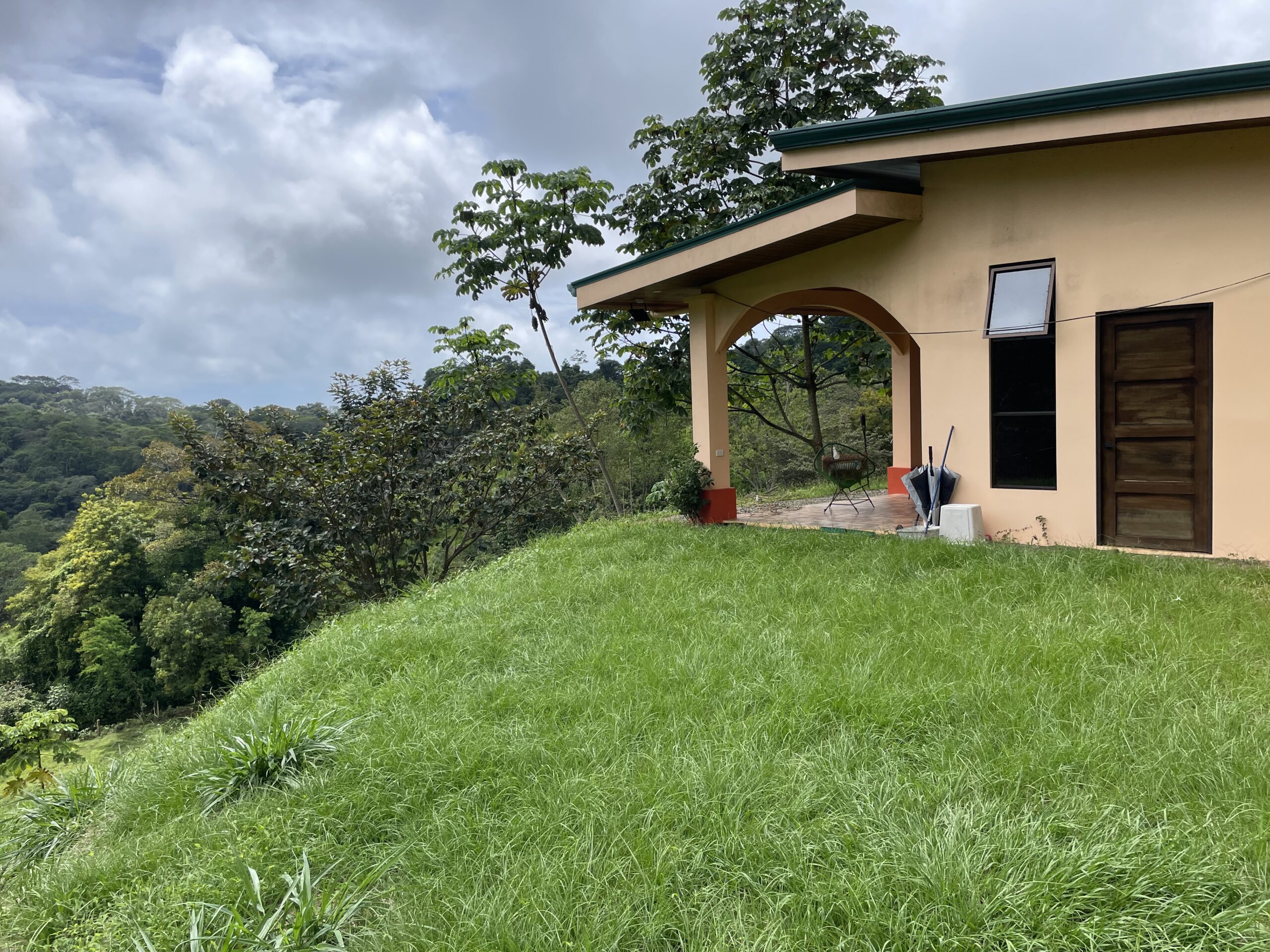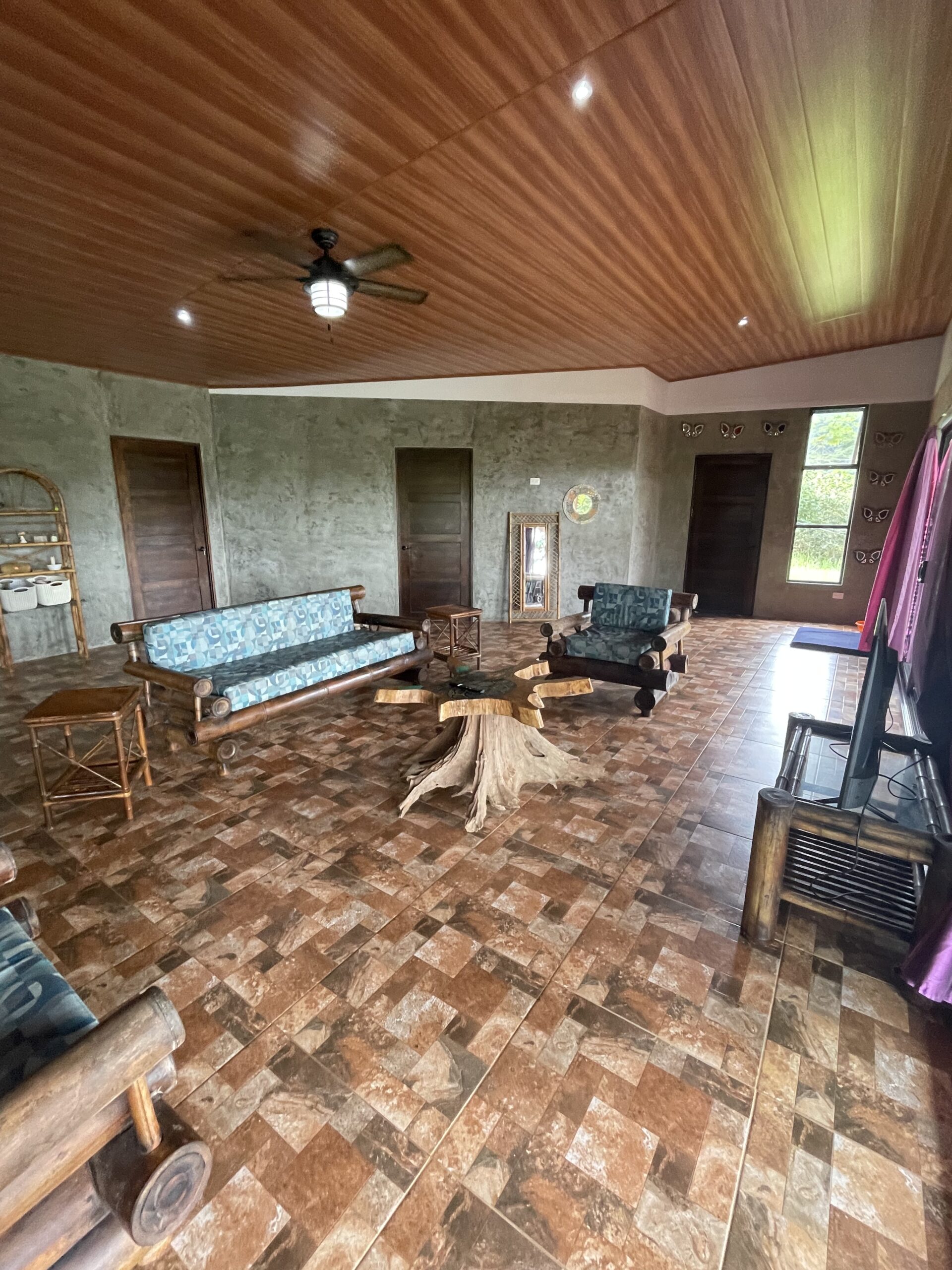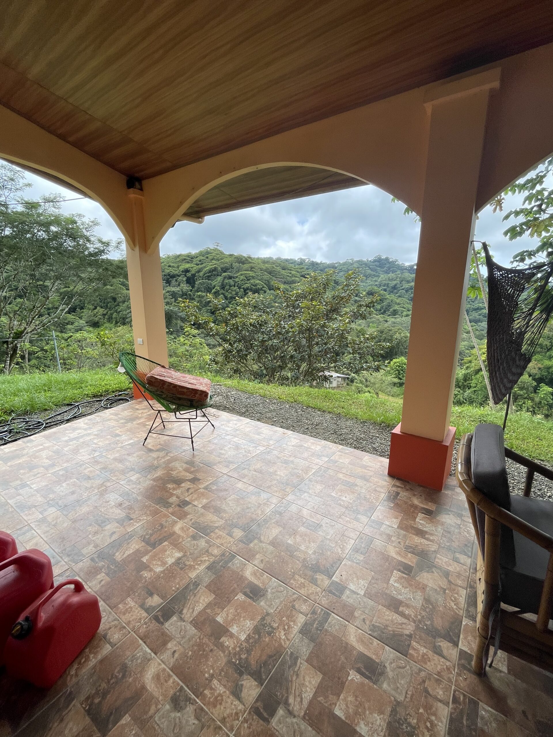 The expansive covered terrace with arched columns, ceiling fans, and accent lighting invites you to relax year-round while listening to the sounds of nature — howler monkeys, tropical birds, and nearby flowing streams perfect for a refreshing dip. The property is partially fenced with durable materials and newly added bamboo for privacy. There’s covered parking for 2–3 vehicles with additional outdoor space behind a secure gate.