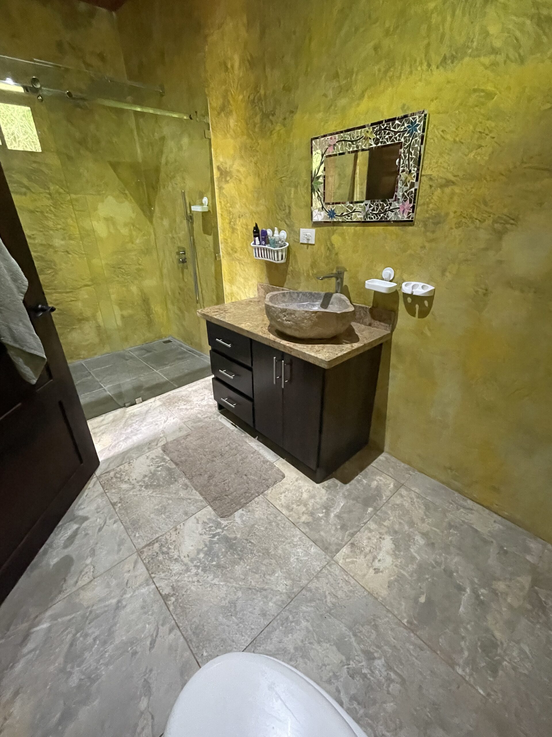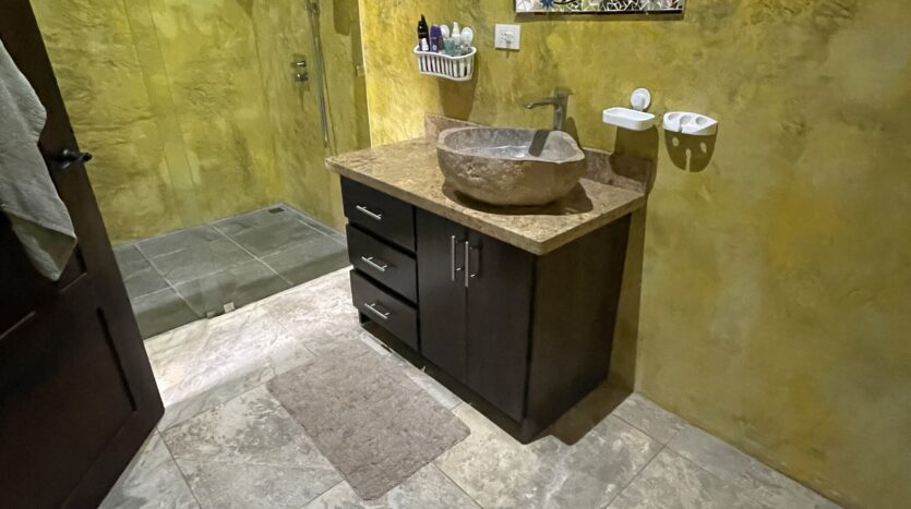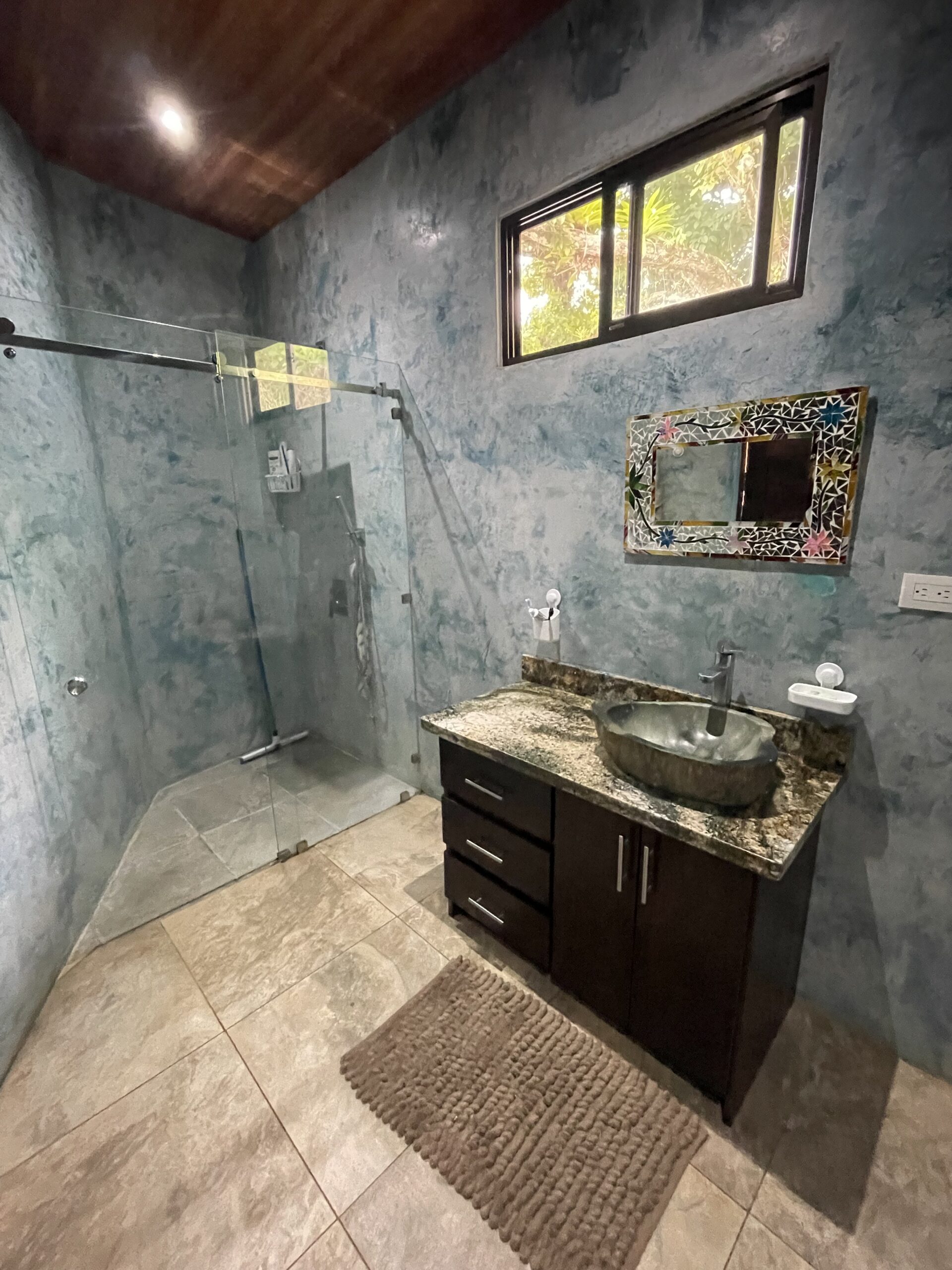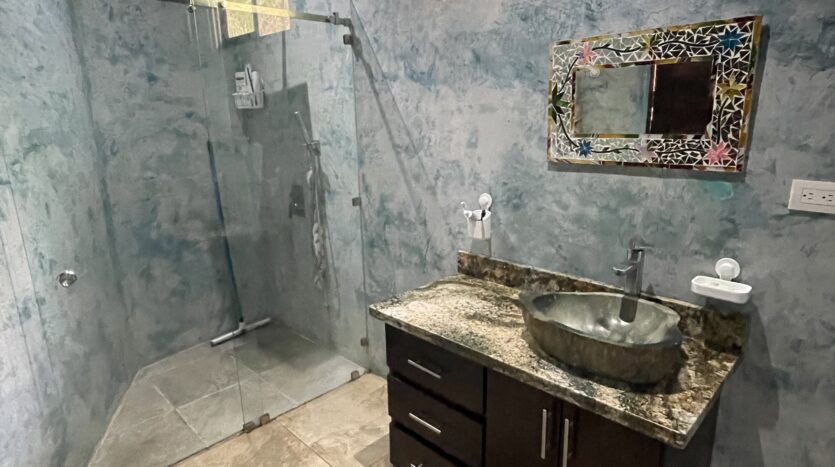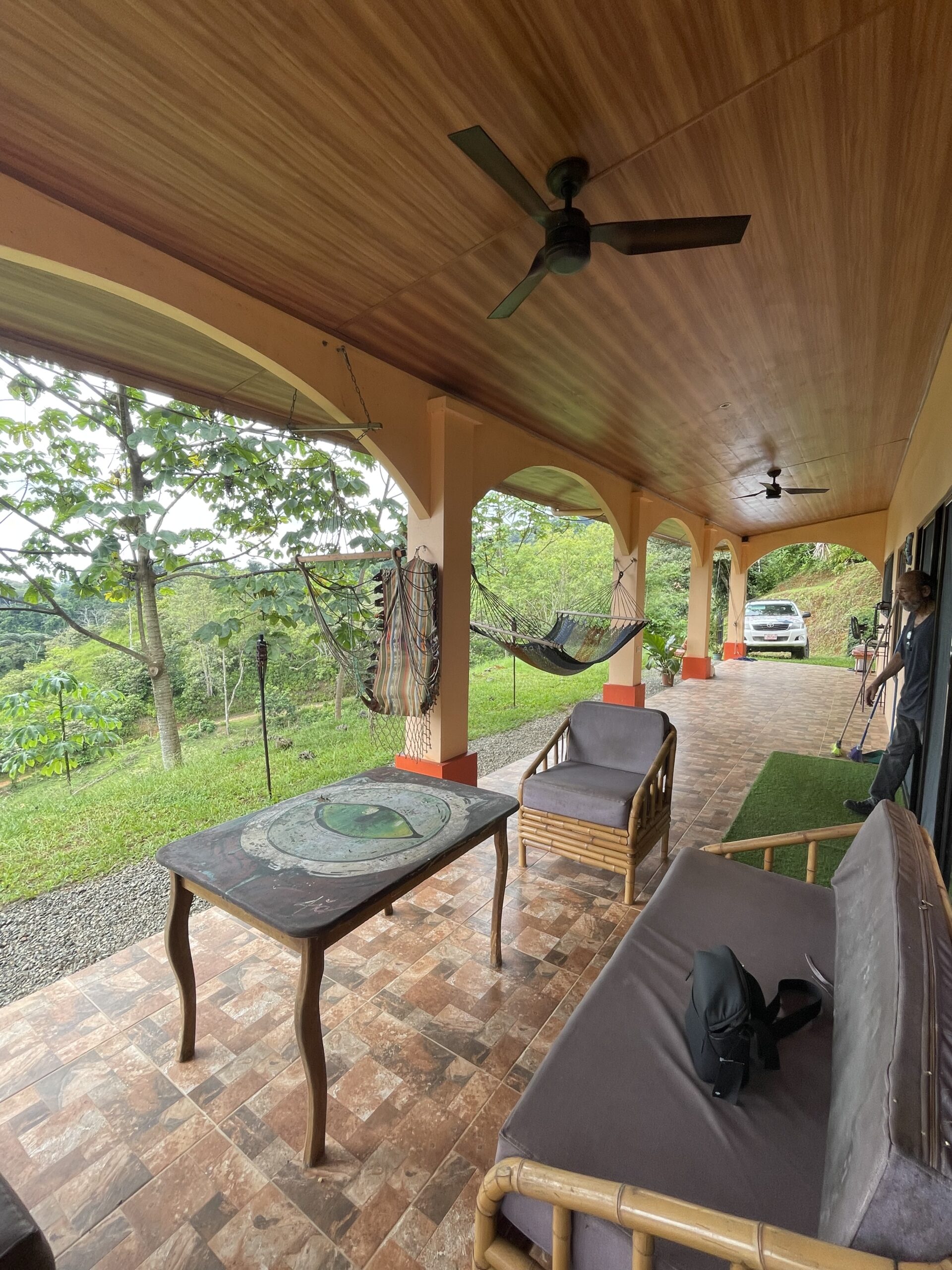 The expansive covered terrace with arched columns, ceiling fans, and accent lighting invites you to relax year-round while listening to the sounds of nature — howler monkeys, tropical birds, and nearby flowing streams perfect for a refreshing dip. The property is partially fenced with durable materials and newly added bamboo for privacy. There’s covered parking for 2–3 vehicles with additional outdoor space behind a secure gate.